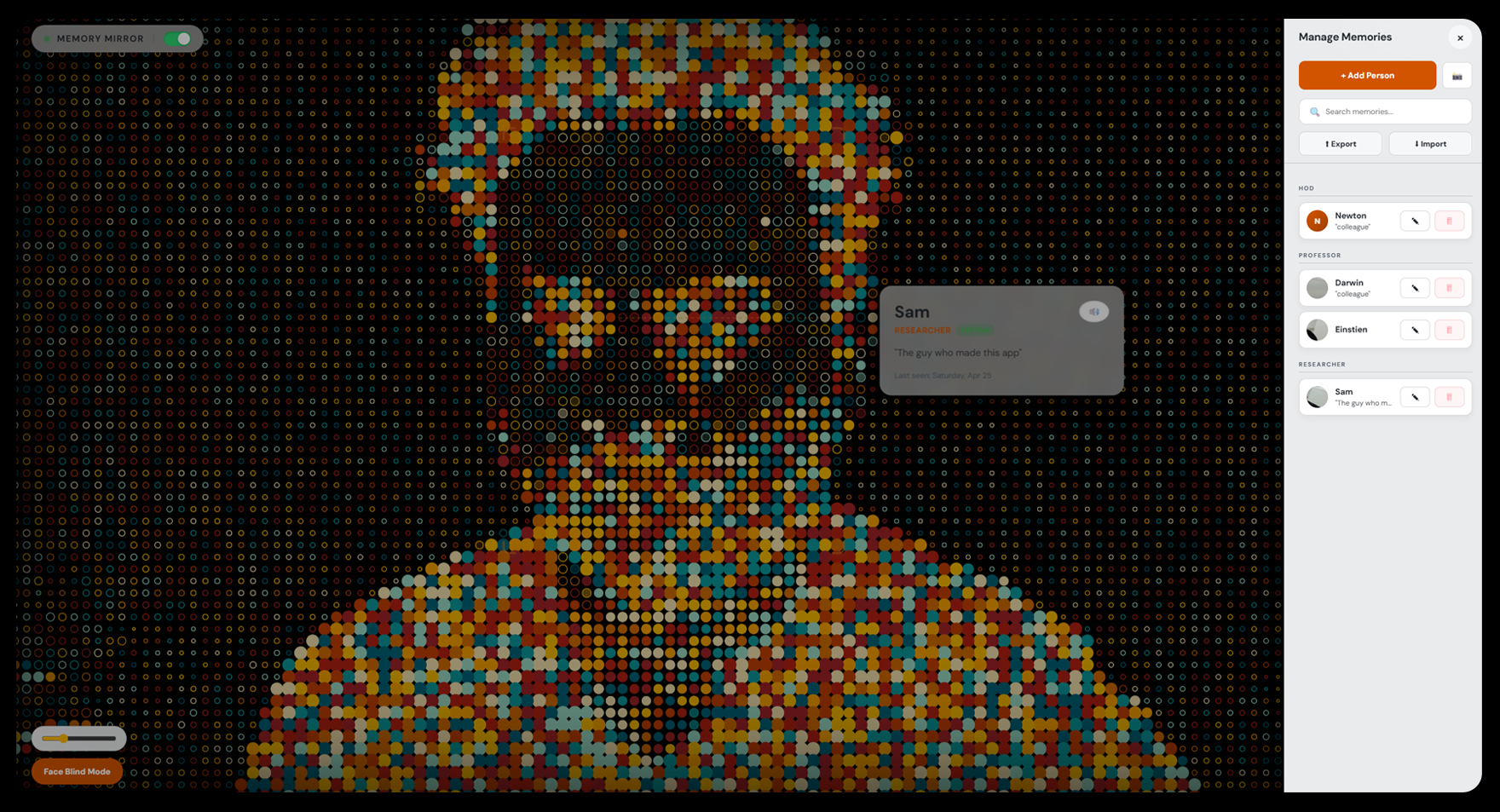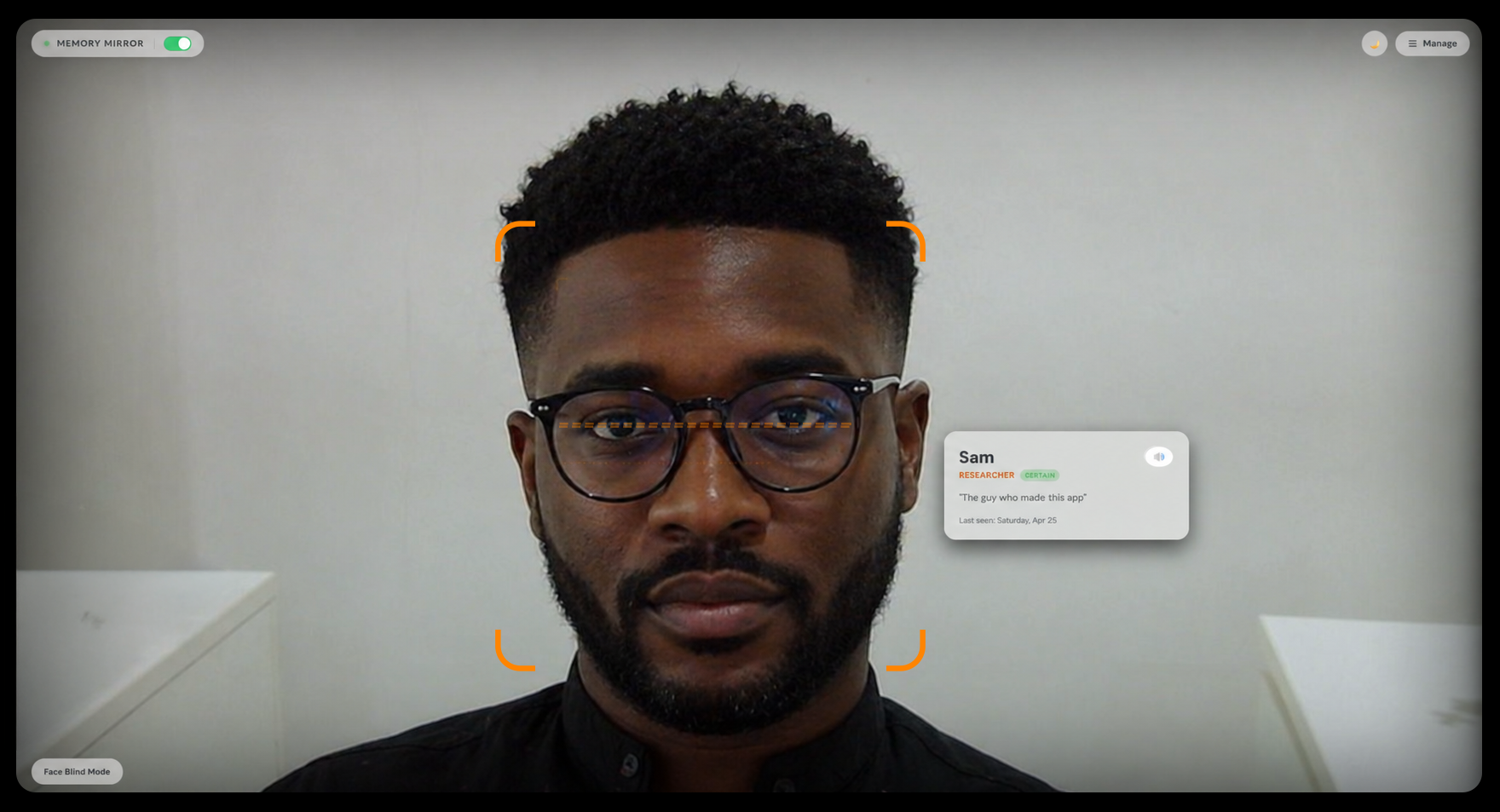 Prosopagnosia, or face blindness, affects an estimated 1 in 50 people, alongside the millions more living with age-related memory decline, early-stage dementia, or cognitive fatigue who struggle to place the faces around them. The social cost is quiet but constant: missed greetings, mistaken identities, the slow withdrawal that follows when introductions feel unsafe.